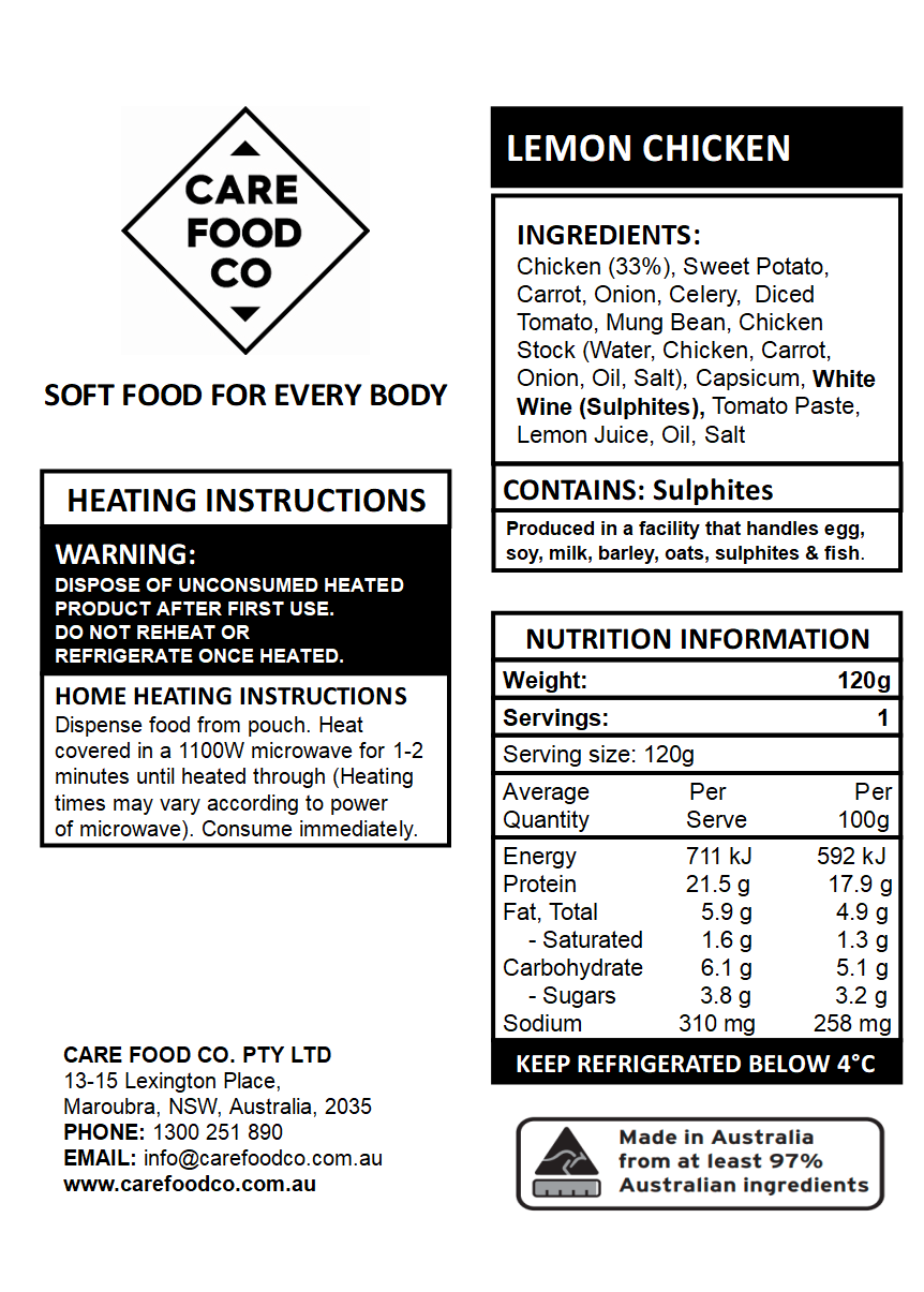 Care Food Co's Lemon Chicken is a soft, texture-modified version of a classic lemon chicken dish, adapted for those who require a soft food diet. Given Care Food Co's commitment to using natural ingredients, the lemon chicken features fresh, natural flavors while maintaining the necessary consistency for ease of consumption.