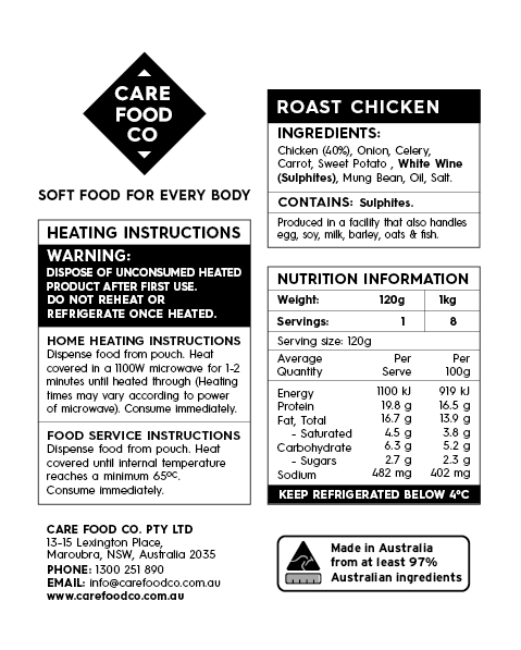 Care Food Co Roast Chicken 120g is a high quality fresh chilled food produced by chefs to help people requiring a texture modified diet, eat better and feel better.