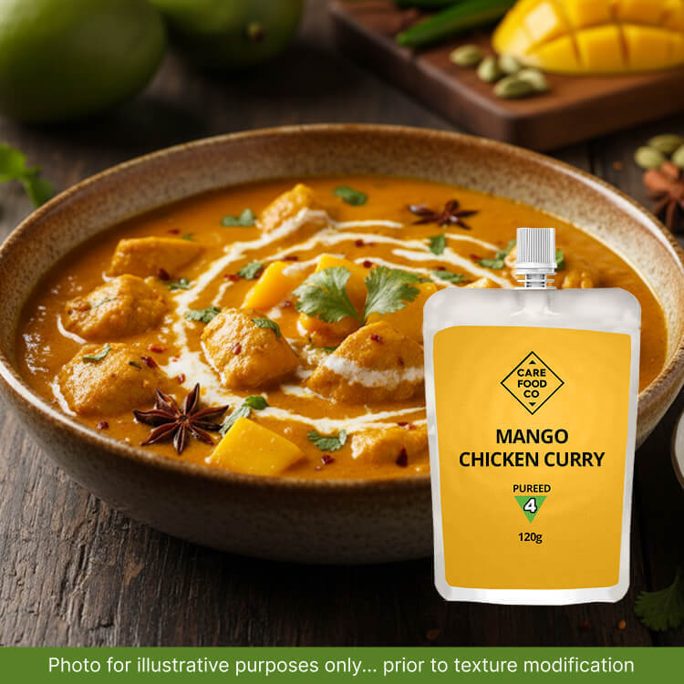 Care Food Co’s Mango Chicken Curry is a delightful fusion of tender chicken and the natural sweetness of ripe mango, simmered in a mild, creamy curry sauce. Specially crafted for those requiring a texture-modified diet, this dish delivers both nutrition and great taste in every bite.